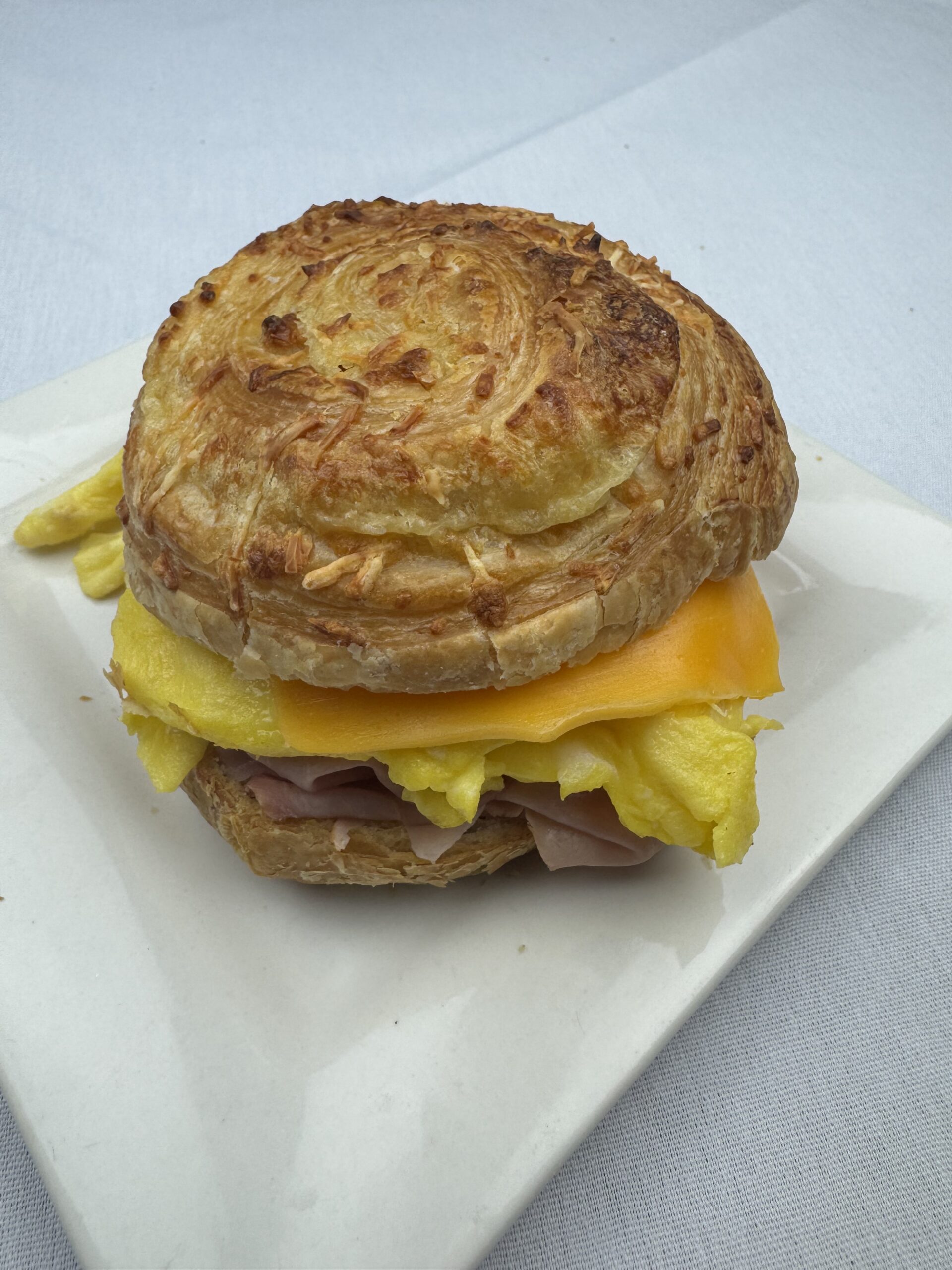 Breakfast Ham, Scrambled Eggs and American Cheese piled high on a Asiago Cheese Swirl Croissant