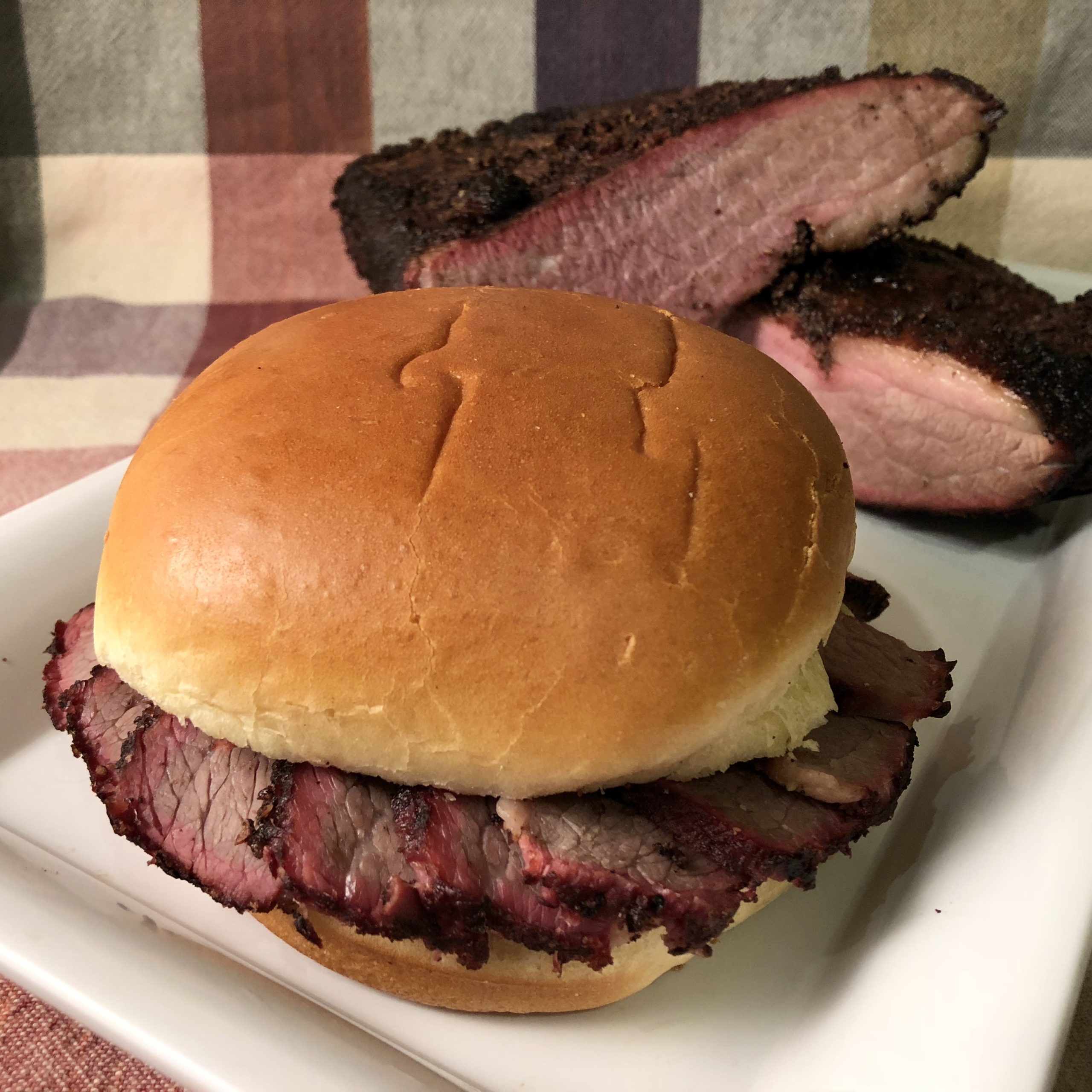 Lehman’s Own “Certified Angus Beef” Brisket that we slowly smoke and roast right here in our kitchen. It is sliced and piled on a Grilled Roll